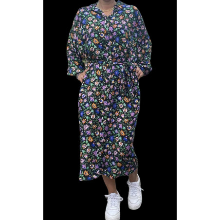 Robe noire longue boutonnée devant avec une ceinture du même tissu que la robe.