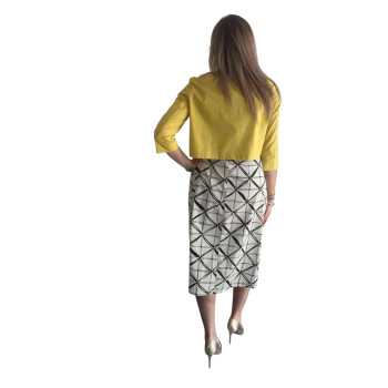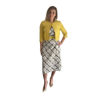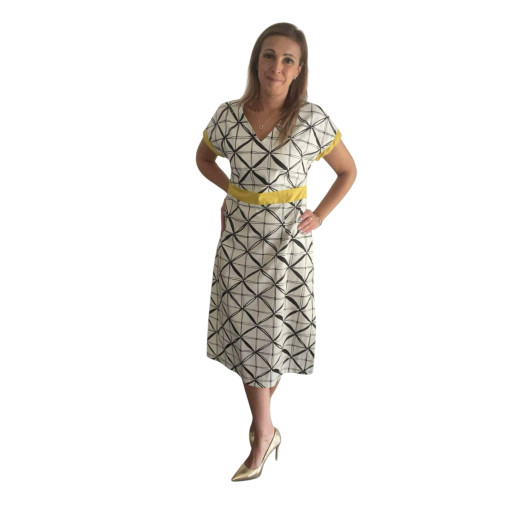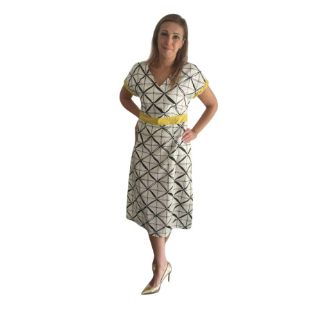 Cette robe mi-longue blanche à motifs géométriques noirs, signée par la marque belge Agua, se distingue par ses finitions jaunes aux manches courtes. Une ceinture assortie vient élégamment souligner la taille, reprenant le détail coloré des manches.